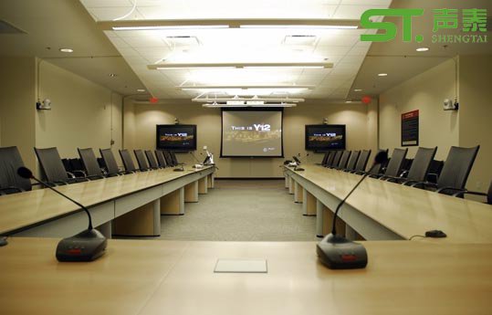 二是會議室要有足夠的吸音和結(jié)構(gòu)處理,混響時間與體積大小有關(guān),體積越大,混響時間越長,小型會議室可控制在0.6秒以下。防止混響時間過長產(chǎn)生語言不清晰。體型較大的會議室采用賽賓公式,較小的廳堂宜采用伊林公式計算混響時間。室內(nèi)混響時間伊林公式為:T60=0.161V/-2.3Slog(1-a)。由此確定吸音材料使用面積及安裝方式。