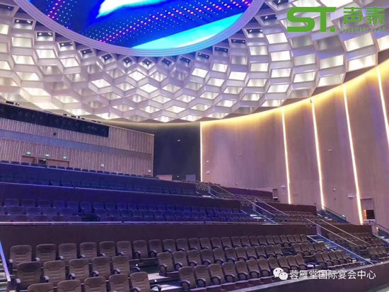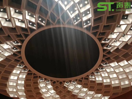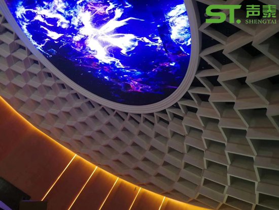 項目使用聲學(xué)材料:陶鋁吸音板,木飾面板,可造型擴(kuò)散體,吸聲軟包