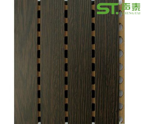 槽木吸音板是一種在密度板的正面開槽、背面穿孔的狹縫共振吸聲材料。常用于墻面或天花裝飾。