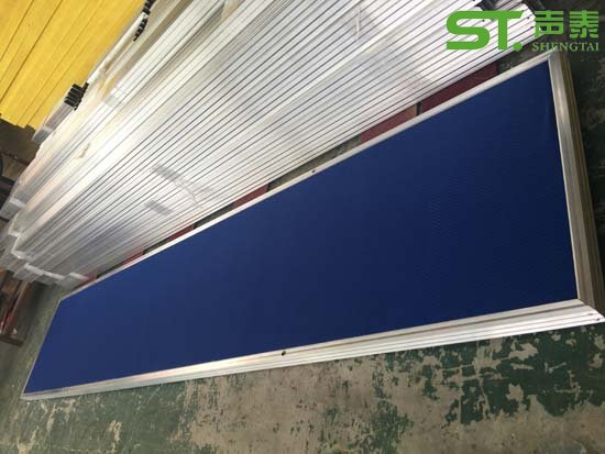 平板式鋁框空間吸聲體也可以簡稱布藝吸音體!空間吸聲體多用于室內體育館(羽毛球館、籃球館、游泳館),其各式各樣的形狀、擺設方式,能增強室內的裝飾效果,最重要的是它的吸音性能,能防止大型廳堂內產生回聲缺陷,并有效降低混響時間。