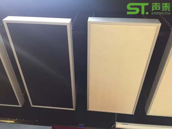 聲泰鋁框空間吸聲體內基材為歐文斯進口玻璃棉板,密度分為80KG,96KG,表面層為A級玻纖布或者B1級裝飾布料