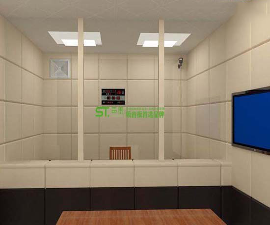 審訊室墻面防撞吸音板分別有哪些?答:吸音軟包,含(布藝軟包吸音板、皮革軟包)、聚酯纖維吸音板兩種,以下是兩種防撞吸音裝飾材料所做的審訊室效果圖。