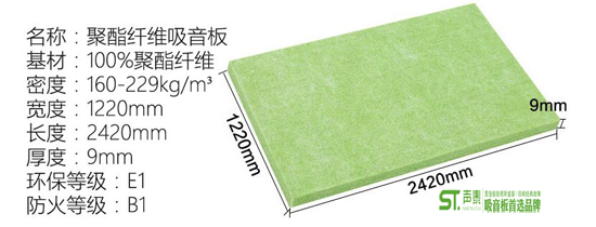聲泰聲學聚酯纖維吸音板具有高密度、環(huán)保、防火、吸聲頻帶寬、裝飾性強、施工簡單、易于切割、無粉塵污染等性能,飾面顏色級材料選擇性廣,能很好地滿足客戶多樣化的聲學及裝飾需求。最高防火性能B1級、最高環(huán)保性能E1級。