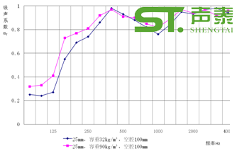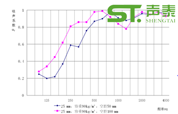 玻纖板相同厚度和容重時(shí),不同空腔的吸聲特性曲線