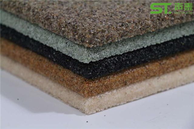 材料精選特定目數(shù)的天然砂粒,將膠凝材料 均勻且極薄地覆蓋于全部微粒表面,形成特定角形系數(shù) 的覆膜微粒。該微粒在外力作用下,覆膜層固化,使微小顆粒就像被焊接一樣聚合在一起,微粒之間天然地形成了大量的、不規(guī)則的、相互連通的微小孔隙,達到很好的吸聲效果。