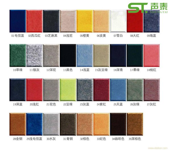 聚酯纖維吸音板有40多種顏色,可以拼成各種圖案。表面形狀有平面、方塊(馬賽克狀)、寬條、細條。板材可彎成曲面形狀。