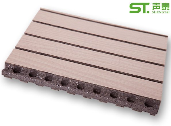 陶鋁裝飾吸音板采用多種不同的無機材料的組合,以無機材料為主要材料,通過添加導(dǎo)電瓷土粉、導(dǎo)電云母粉等導(dǎo)電材料、增強纖維等材料,采用無機黏合劑粘合,自然固化的方法而 成的特殊板 材,再在其表面復(fù)合多種不同的裝飾材料,從而形成不同的裝飾效果。實現(xiàn)吸聲的技術(shù)原理是:一是在材料本身內(nèi)形成多孔結(jié)構(gòu),達到一定的吸聲效果,其二是在成 品板上通過開槽、鉆孔形成穿孔板共振結(jié)構(gòu),達到吸聲效果。并配合吸聲無紡布進一步提升吸音效果。