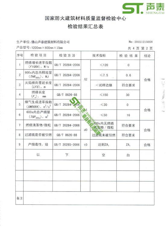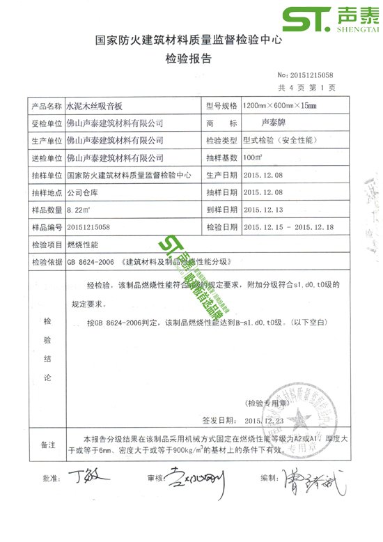 佛山聲泰木絲吸音板防火阻燃檢測報告