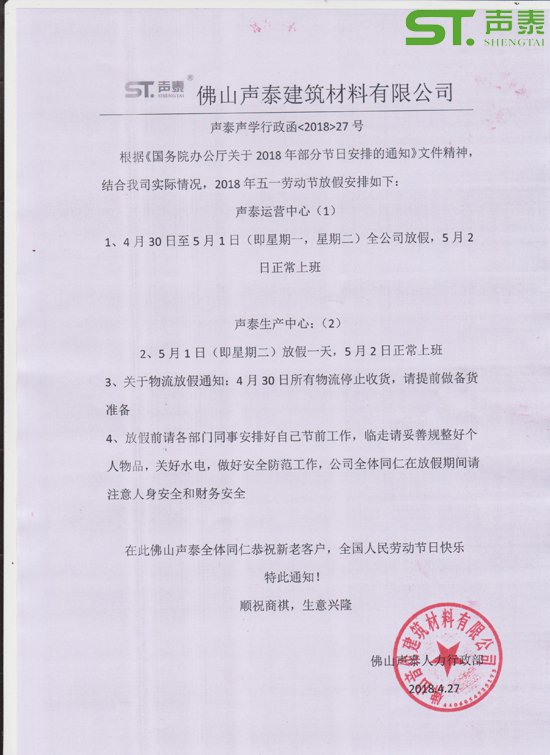 國內聲學材料品牌生產廠家【佛山聲泰】五一勞動節放假通知